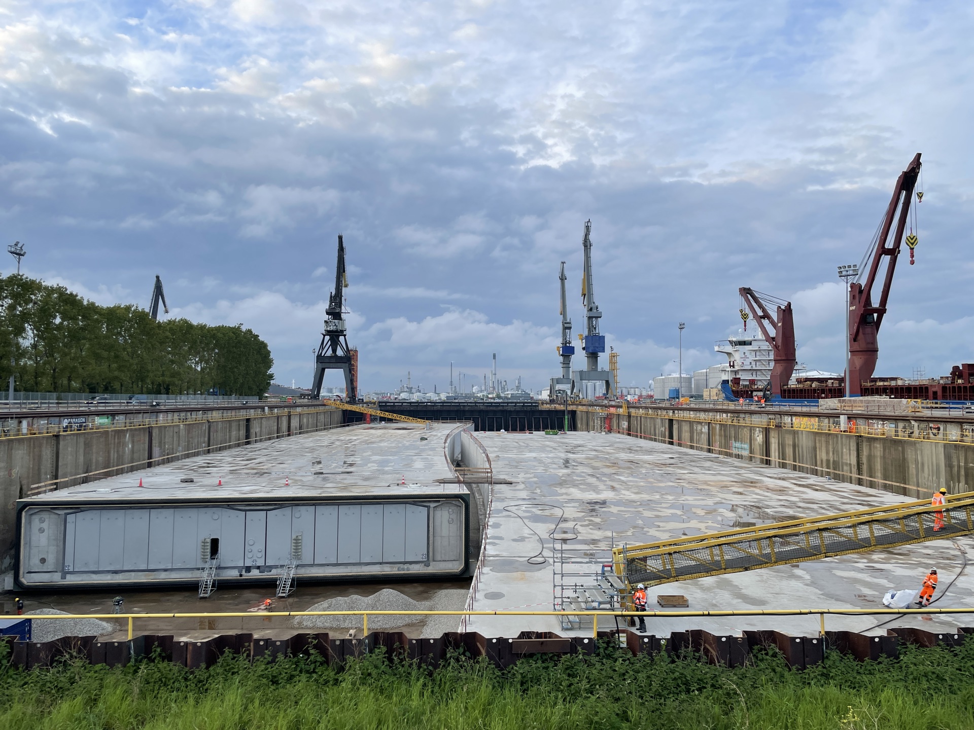 Aan het testen en uitvaren is dagenlang gewerkt. Voordat de tunneldelen konden worden uitgevaren, zijn ze eerst uitvoerig getest. De eerste test vond plaats in het droogdok. Hiervoor hebben we het dok langzaam vol laten lopen met water, waardoor de twee zinkelementen zijn gaan dobberen. Samen met consortiumpartner DEME en opdrachtgever Rijkswaterstaat is vervolgens gecontroleerd welk effect het water op de elementen heeft.
