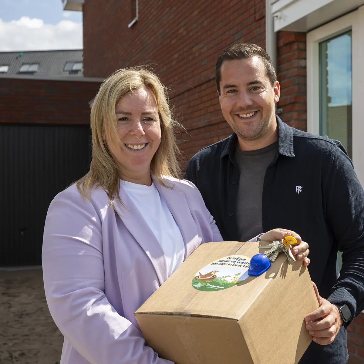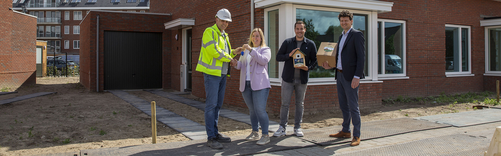 Maurice en Merel hebben de sleutel van hun huis gekregen: “Het duurzame aspect van Tuinbuurt Vrijlandt sprak ons erg aan”, aldus Maurice. “We zijn blij dat we van het gas af zijn en onze eigen energie opwekken. We hebben nu al contact met de andere nieuwe bewoners en hebben veel zin om met elkaar een fijne wijk te creëren.”