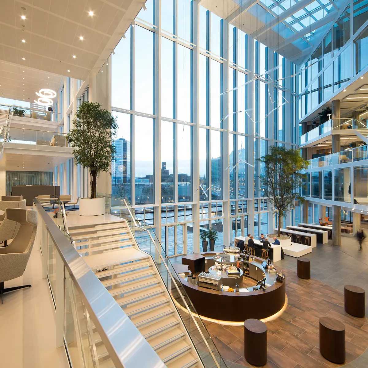 Centraal in het ontwerp van het gebouw, het interieur en de dienstverlening staan de gebruikersbehoeften. R Creators heeft zich hierin grondig verdiept en dat vertaald naar een integraal ontwerp. Gebouw, interieur en dienstverlening zijn geen losse elementen, maar versterken elkaar. Zo verleiden we bezoekers om naar Rijkskantoor De Knoop te komen. Bij de ontwerpoplossingen is niet gekeken naar de initiële kosten, maar naar de totale kosten over twintig jaar.