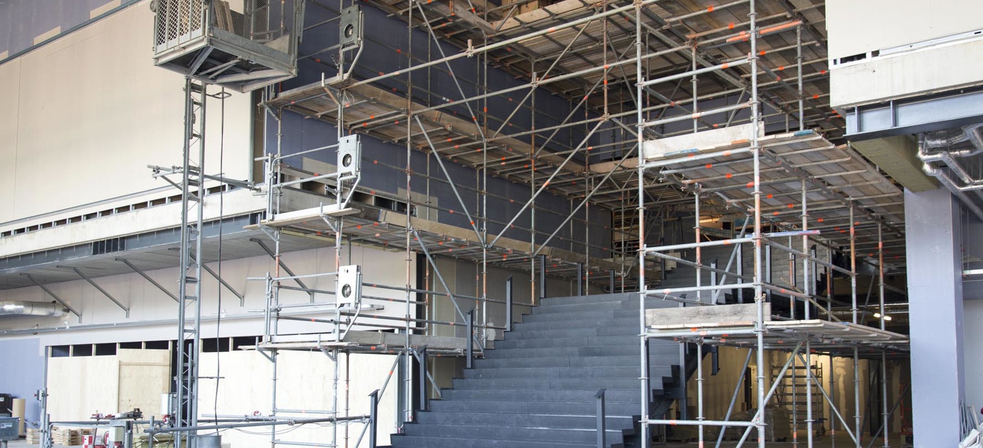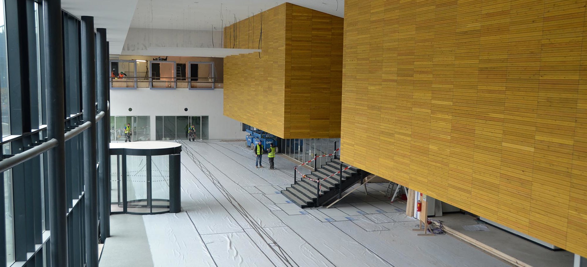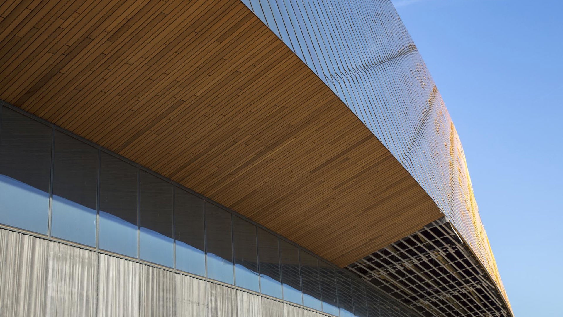 De nieuwbouw is prestigieus, want de Sportcampus moet uiterst functioneel zijn, professionaliteit uitstralen én mensen inspireren het beste uit zichzelf te halen. Het gebouw heeft een ronde gevel met prefab betonnen sierelementen. Daarboven zit een in hoogte en diepte variërende luifel met roestvrijstalen shingles. Fraai, maar zeer bewerkelijk. Met de producent legden we alle afmetingen nauwkeurig vast.