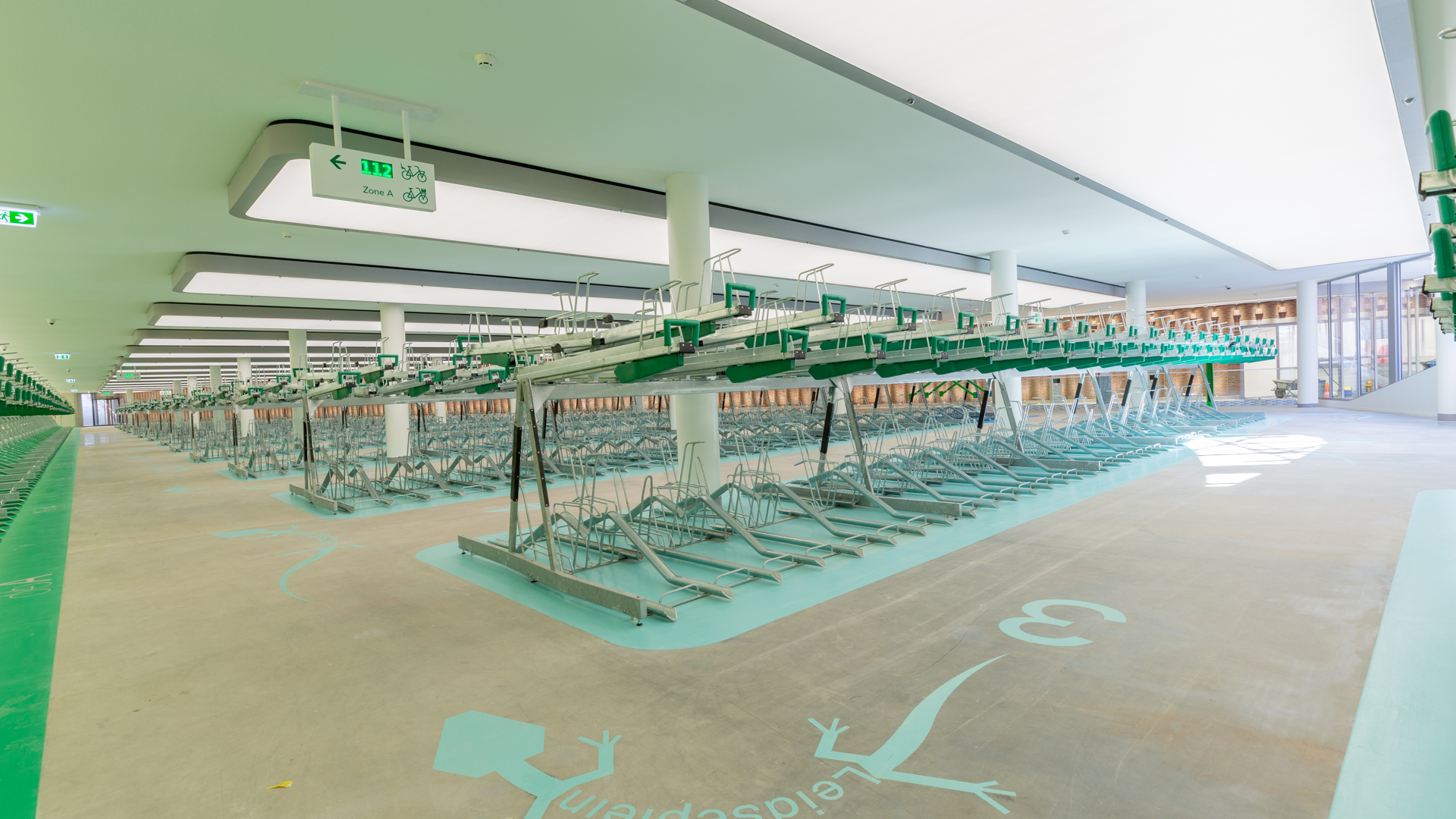 Op het Leidseplein en het Kleine-Gartmanplantsoen stonden dagelijks zo’n 3500 fietsen geparkeerd. Dat is inmiddels verleden tijd. Met de realisatie van de ondergrondse fietsenstalling, bestaande uit een robuuste constructie met één bouwlaag, creëerden we parkeergelegenheid voor meer dan 2.000 fietsen. Om die capaciteit te realiseren, hebben we de plek zo efficiënt mogelijk ingericht. Zo is er ruimte gemaakt voor 2-laagse fietsrekken, hebben we de beheerdersruimte op een slimme plek gepositioneerd en is er voldoende stallingsruimte gecreëerd voor fietsen met een afwijkend formaat.