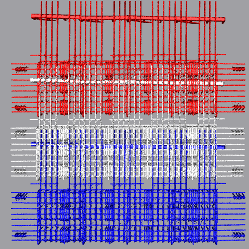 De korven worden onderling verbonden met wapeningsstaven die we ‘laslengtes’ noemen. Uiteindelijk voegen we alle scans per onderdeel van de vloer samen, zodat we de laslengtes van het bovennet in kaart kunnen brengen. Ieder boorgat krijgt een coördinaat waarbij we ervoor zorgen dat de laslengtes niet worden geraakt.