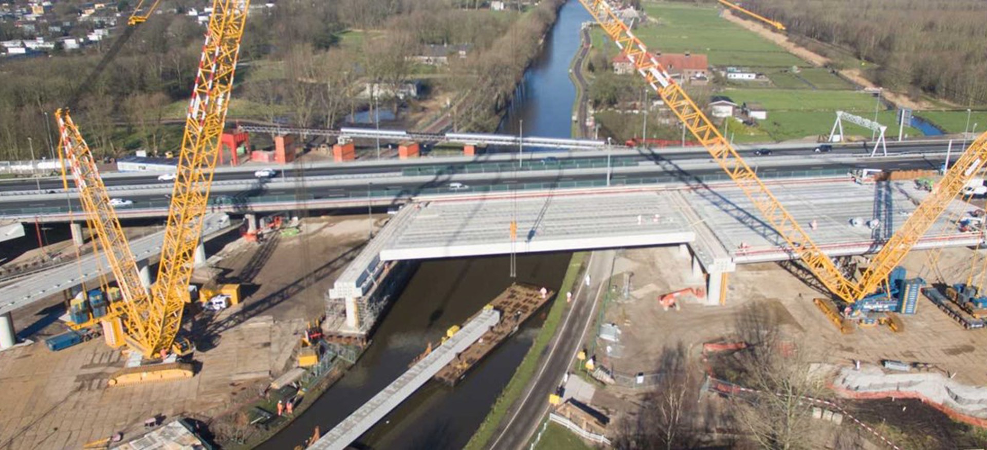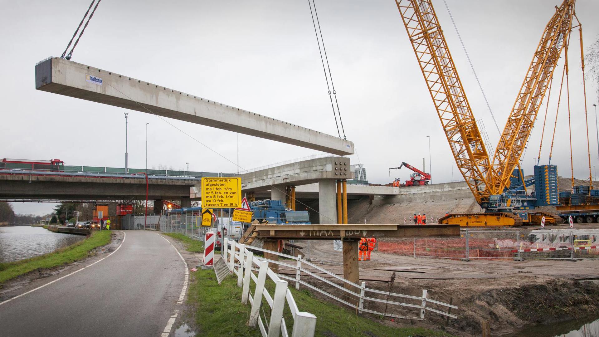 Haitsma Beton levert voor beide bruggen enorme voorgespannen kokerliggers, waarvan de grootste een lengte heeft van 57 meter, een breedte van twee meter en een gewicht van 230 ton.