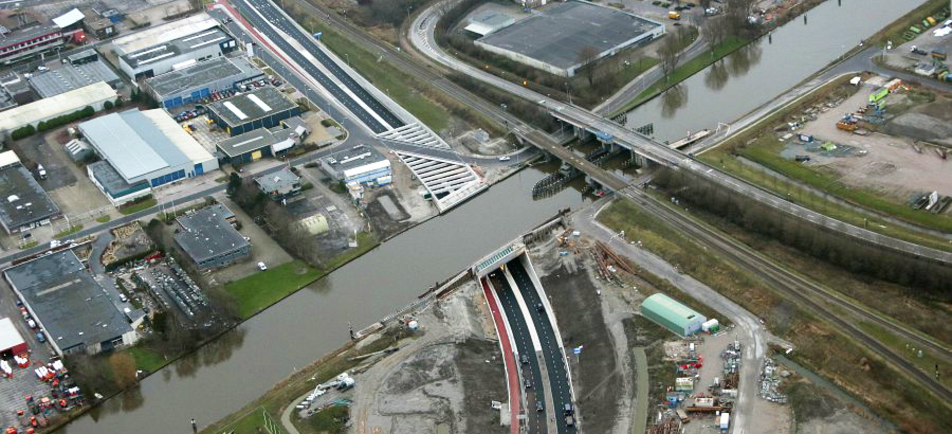 Tijdens ons werk bleef het kanaal steeds open voor de scheepvaart. Ook het nabijgelegen bedrijventerrein, de spoorlijn en de spoorbrug bleven in gebruik. Vooral de spoorbrug vroeg speciale aandacht, want een minimale verzakking kon grote gevolgen hebben voor het treinverkeer. Trillingen werden volgens strenge normen gemonitord. Met een goed verlopen proces als resultaat.