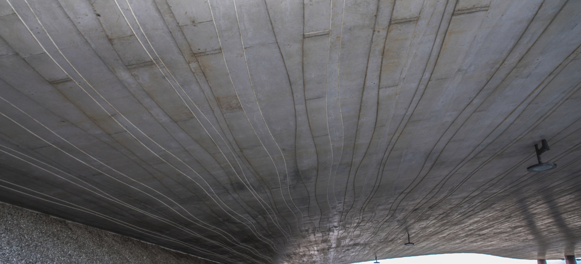 Zowel het ontwerp als de manier van bouwen kennen unieke kenmerken. Als je onder ‘de zeemeeuw’ doorrijdt, zie je bijvoorbeeld een prachtig geribbeld patroon in het beton. Dit doet denken aan ‘‘een strandvlakte waarop wind en water hebben ingewerkt”. Het is een monnikenwerk volgens de projectleider, maar met geweldig resultaat.