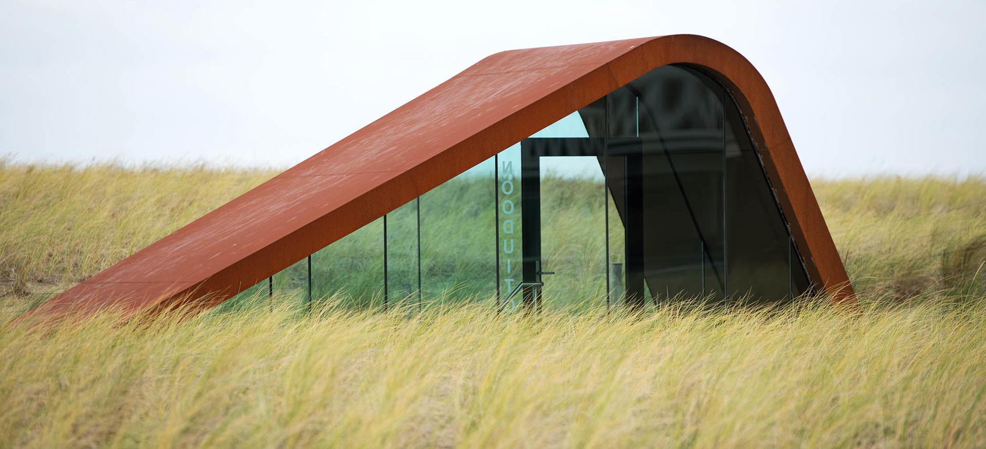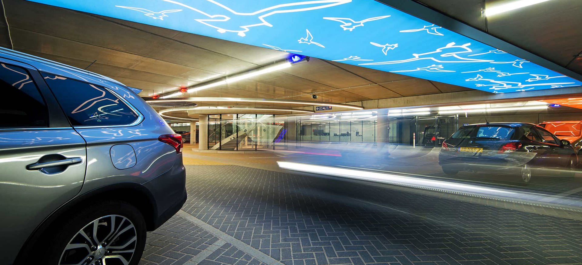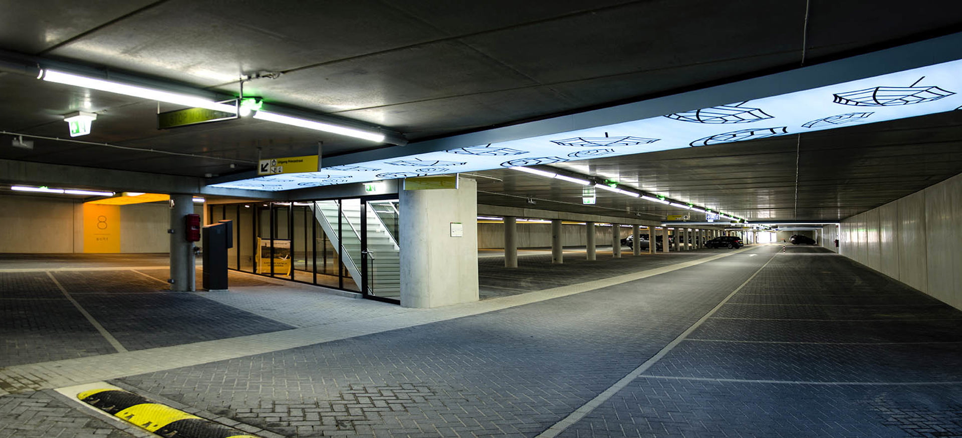 Deze ondergrondse garage is uniek in zijn soort. Zo zijn alle entrees en in- en uitritten op een natuurlijke wijze opgenomen in het weidse duinlandschap. Pas bij aankomst wordt onthuld wat er zich ondergronds afspeelt. De garage heeft een langgerekte vorm, wat speciale aandacht van de bouw vroeg. Bezoekers moeten zich immers veilig voelen en eenvoudig de weg naar het strand of dorp weten te vinden. Daarom zijn er zo min mogelijk obstakels in het zicht geplaatst, zoals kolommen en installaties. Bovendien komt door de glazen gevel veel daglicht in de garage, wat de oriëntatie bevordert.