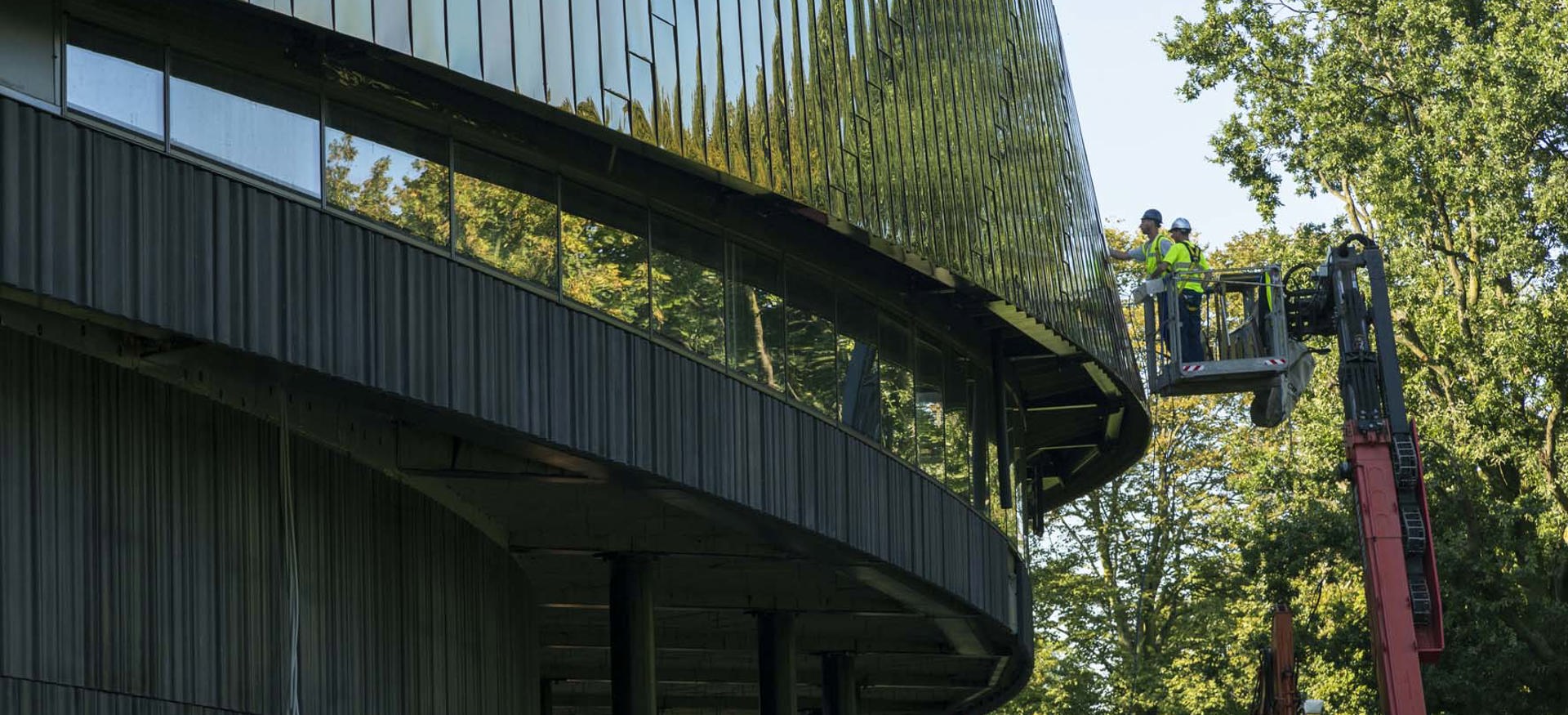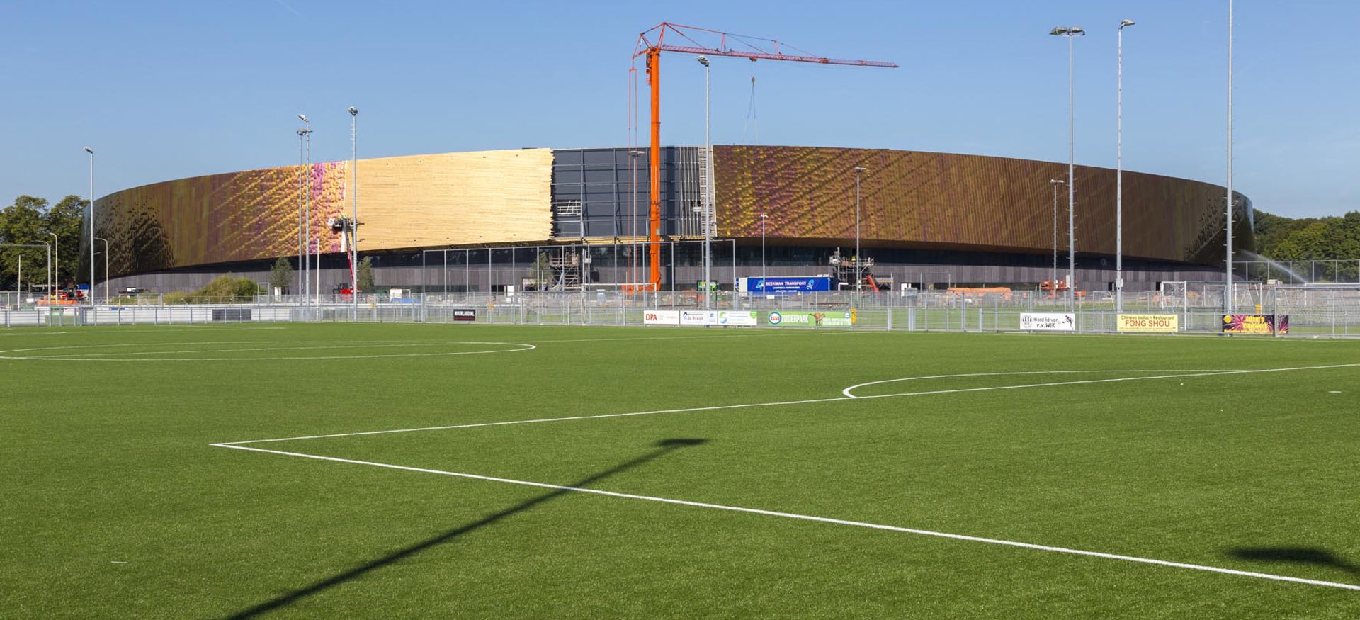 De nieuwbouw is prestigieus, want de Sportcampus moet uiterst functioneel zijn, professionaliteit uitstralen én mensen inspireren het beste uit zichzelf te halen. Het gebouw heeft een ronde gevel met prefab betonnen sierelementen. Daarboven zit een in hoogte en diepte variërende luifel met roestvrijstalen shingles. Fraai, maar zeer bewerkelijk. Met de producent legden we alle afmetingen nauwkeurig vast.