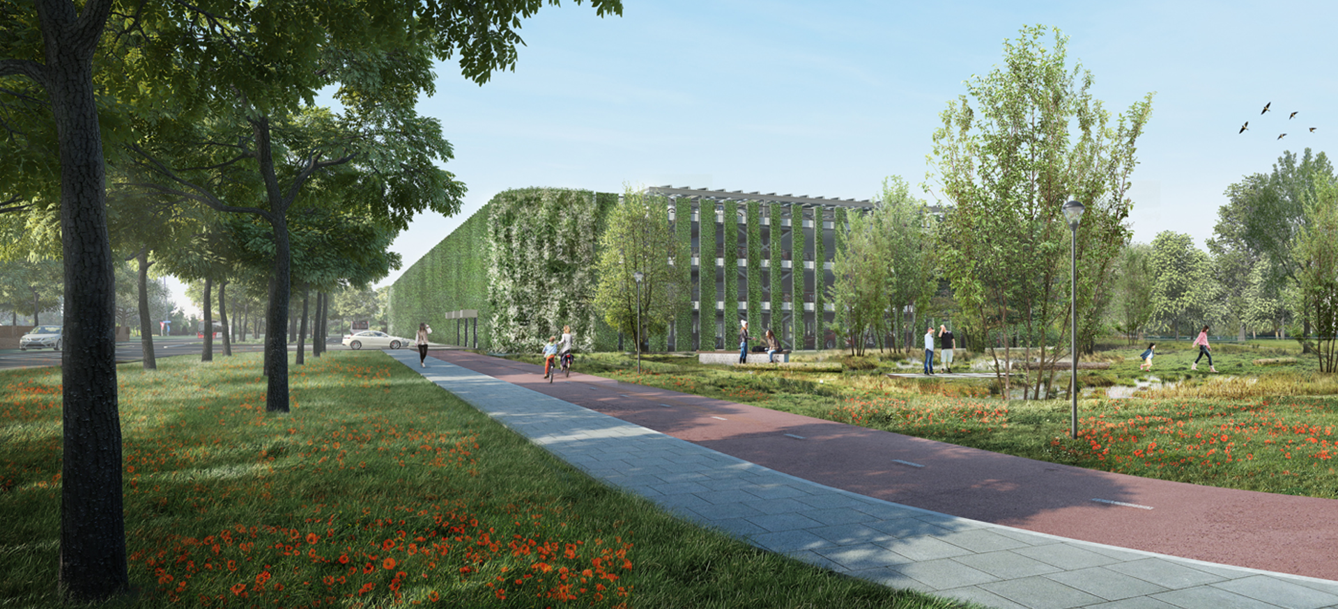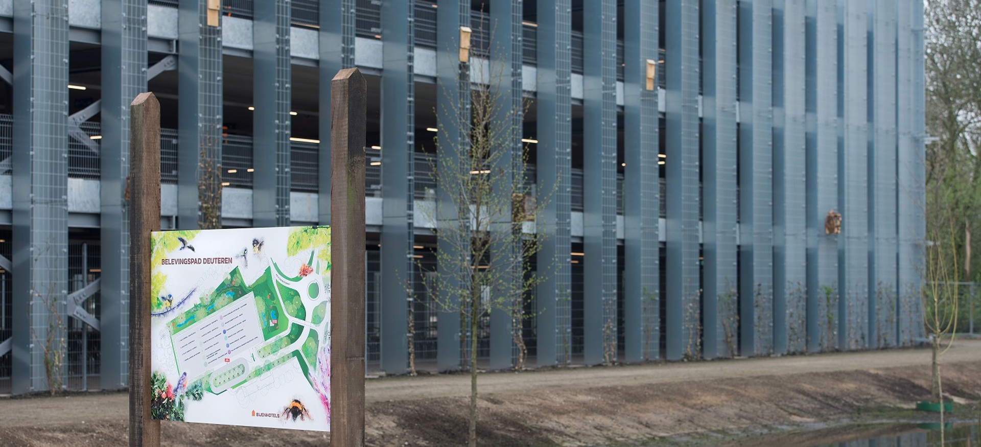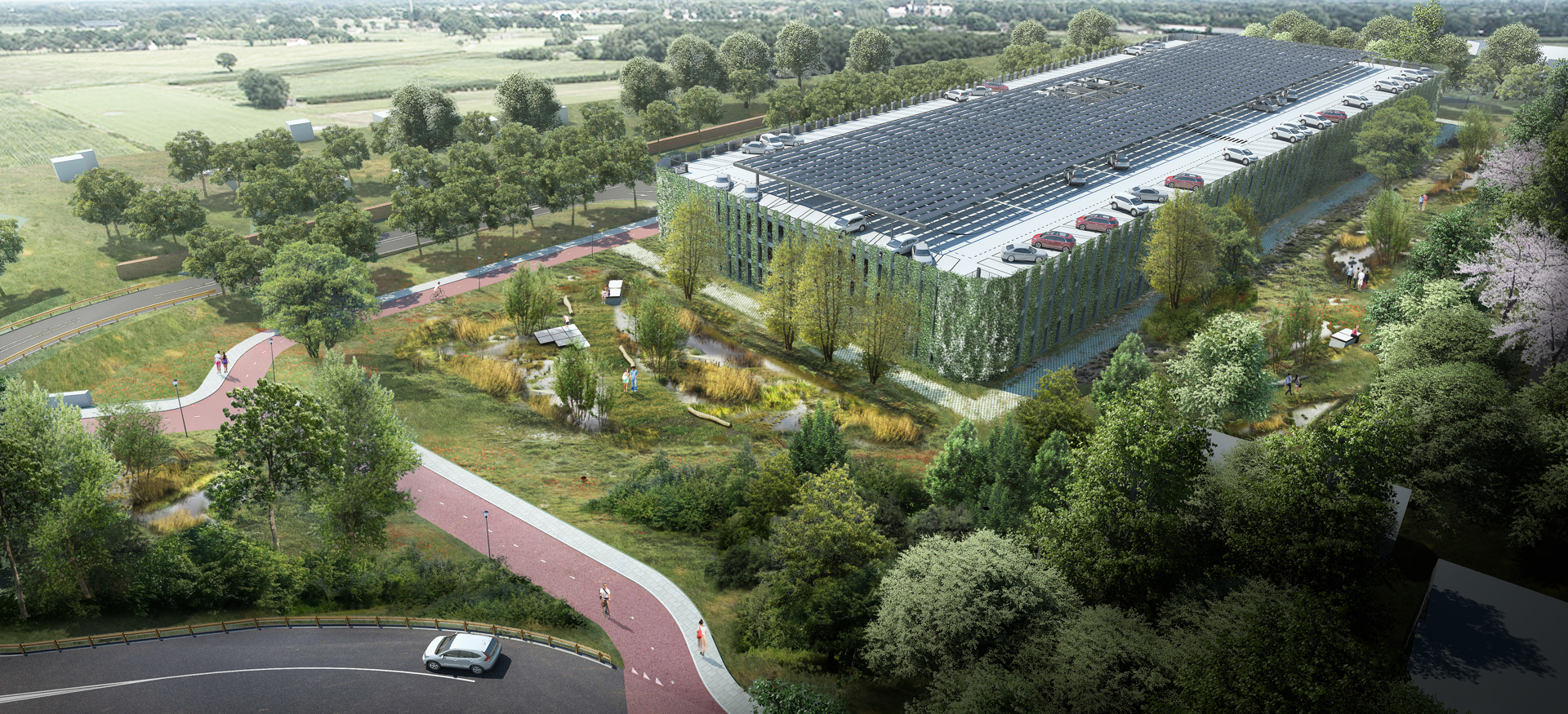 Ook in duurzaam opzicht ligt de lat hoog, wat te zien is aan de binnen- en buitenkant van de parkeergarage. Wandelaars lopen via wadi’s en een natuurbelevingspad langs de groene gevel. Deze wordt geheel begroeid met planten, zodat het gebouw opgaat in het landschap. Zonnepanelen zorgen voor een energieleverend gebouw. Samen met ecologische maatregelen, zoals aanplant van bomen, hergebruik van gekapt hout, inpassing in het ecologische landschap en een bijenhotel, verwezenlijken we zo onze duurzaamheidsambities.