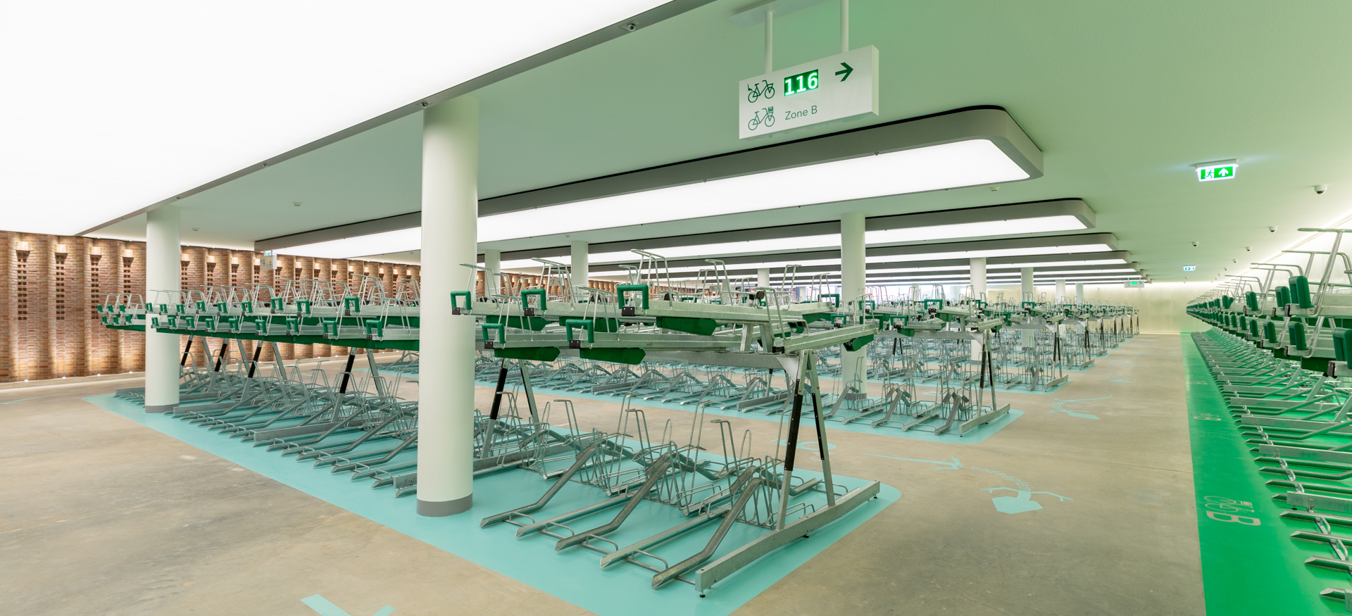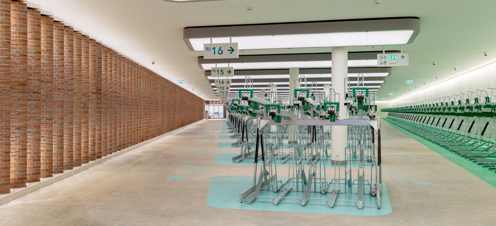 Op het Leidseplein en het Kleine-Gartmanplantsoen stonden dagelijks zo’n 3500 fietsen geparkeerd. Dat is inmiddels verleden tijd. Met de realisatie van de ondergrondse fietsenstalling, bestaande uit een robuuste constructie met één bouwlaag, creëerden we parkeergelegenheid voor meer dan 2.000 fietsen. Om die capaciteit te realiseren, hebben we de plek zo efficiënt mogelijk ingericht. Zo is er ruimte gemaakt voor 2-laagse fietsrekken, hebben we de beheerdersruimte op een slimme plek gepositioneerd en is er voldoende stallingsruimte gecreëerd voor fietsen met een afwijkend formaat.